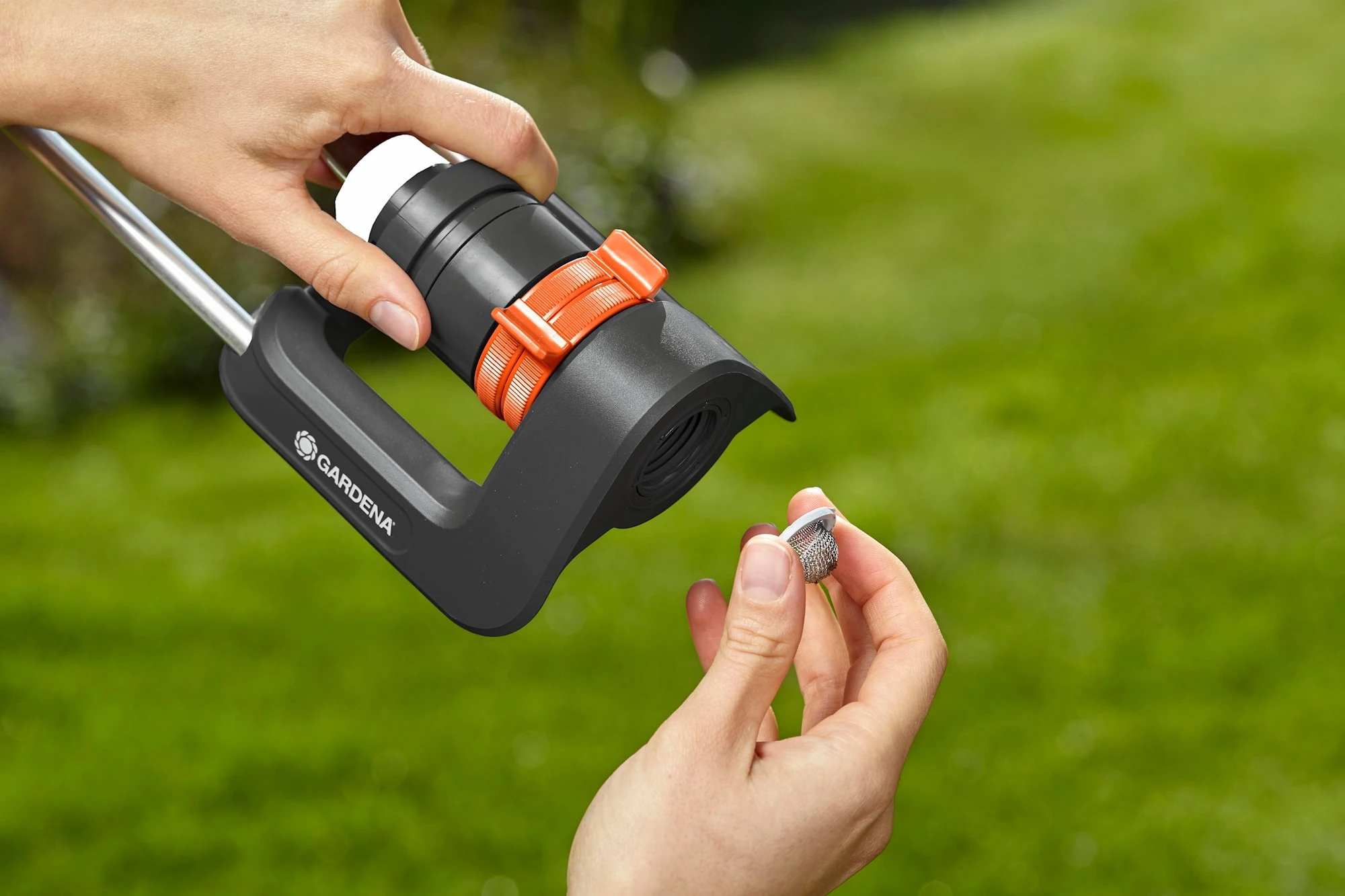 Placera den bara pÄ grÀsmattan och stÀll in rÀckvidden till mellan 7 och 17 m med hjÀlp av reglaget. Maxbredden för Aqua S Àr 13 m. NÀr slangen har kopplats in kan du slÄ pÄ vattnet sÄ att dina vÀxter fÄr en jÀmn bevattning. Det hÄllbara materialet med metallkomponenter sÀkerstÀller att vattenspridaren stÄr stadigt. Att rengöra Aqua S Àr lika enkelt som att montera den. Vattenkopplingen har ett inbyggt metallfilter som Àr enkelt att avlÀgsna genom att rotera kopplingen. Skölj bara under rinnande vatten för att rengöra. AnvÀnd den medföljande nÄlen för att avlÀgsna eventuella kalkavlagringar frÄn munstyckena. Du hittar den i skruvkorken pÄ motsatt sida av vattenspridaren. Rengör munstyckena genom att peta lÀtt med nÄlen.
