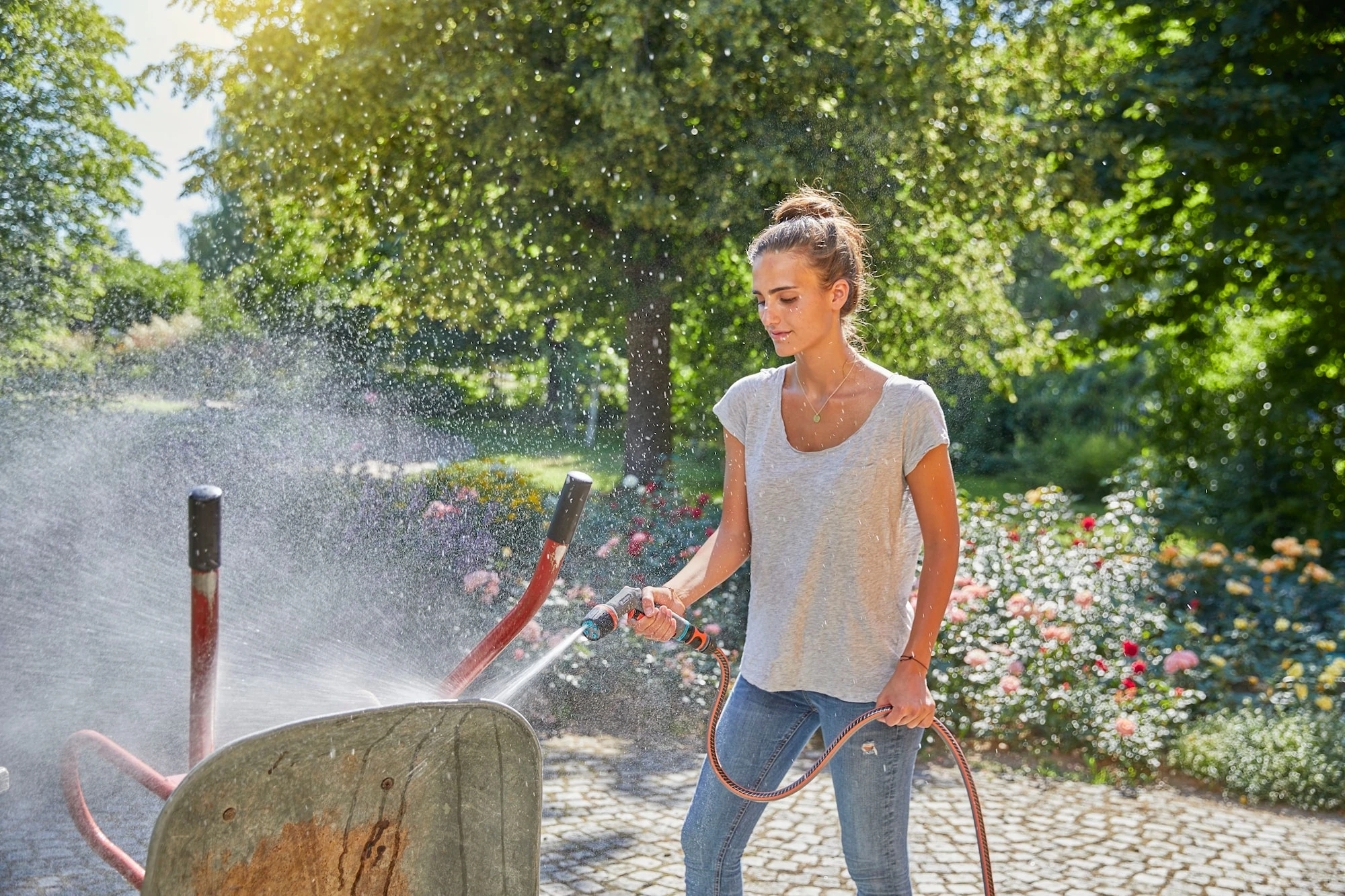 GARDENA Comfort rengöringsmunstycke ecoPulse Àr lika lÀmpligt för bÄde effektiv rengöring och för bevattning. Sprutmunstycket har en innovativ ecoPulse-strÄle. Den oscillerande vattenstrÄlen Àr sÀrskilt effektiv vid ytrengöring och sparar upp till 40 % vatten jÀmfört med GARDENAS hÄrda standardstrÄle.