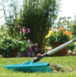 Med Gardena combisystem GrÀsmatterÀfsa tar du effektivt bort klipprester och löv frÄn grÀsmattan.