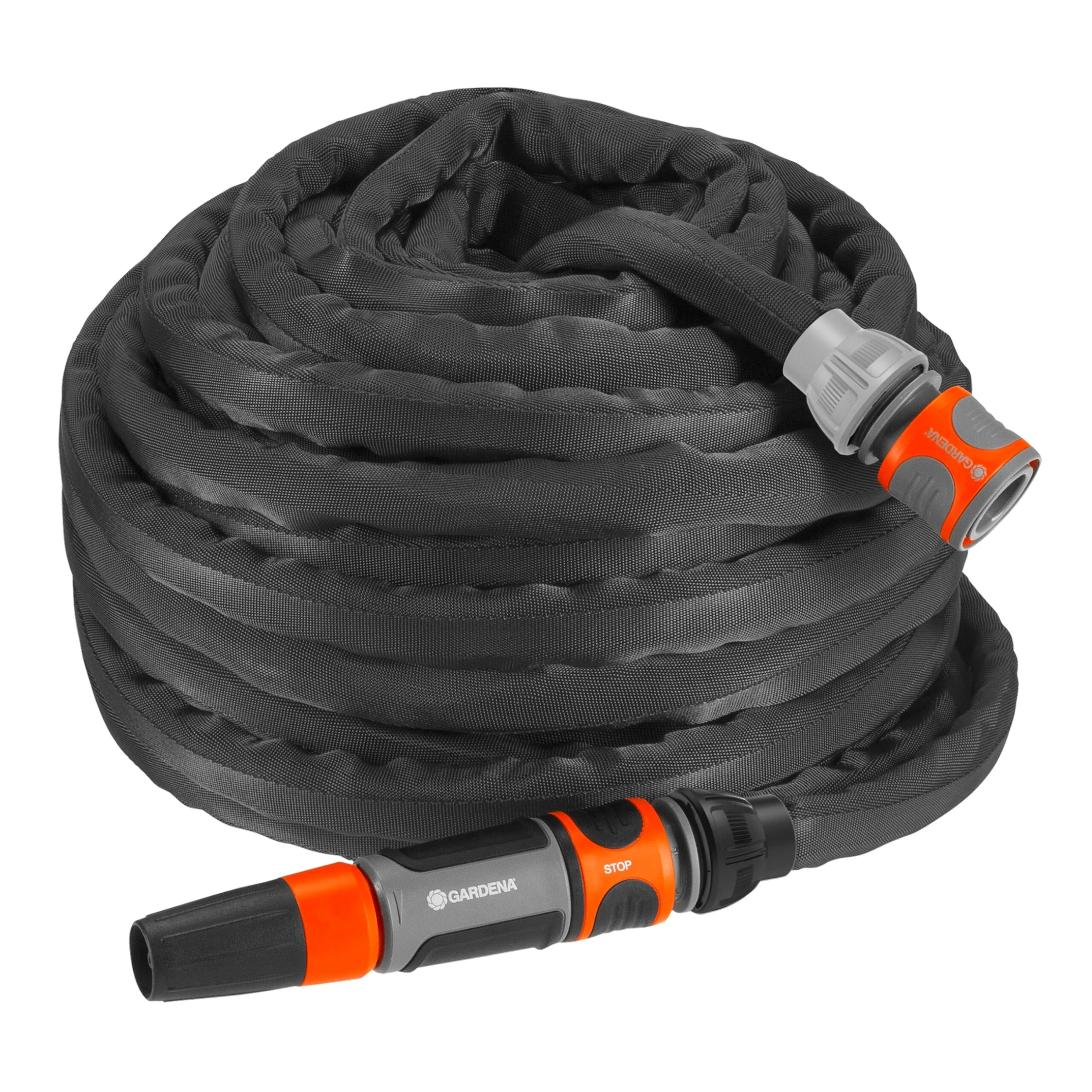 GARDENAs textilslang Liano, tillverkad av mycket slitstarkt tyg, Àr sÀrskilt bekvÀm att hantera och exceptionellt smidig. Slangen klarar maximal belastning i trÀdgÄrden och Àr tryckbestÀndig upp till 35 bar. Den lÄga vikten gör förvaringen sÀrskilt enkel. Passar Àven för slangvagnar och slangvindor. Paketet med textilslangen Liano 20 m levereras komplett med en gÀngad krankoppling lÀmplig för tre olika gÀngstorlekar, slangkoppling, vattenstopp och rengöringsmunstycke.