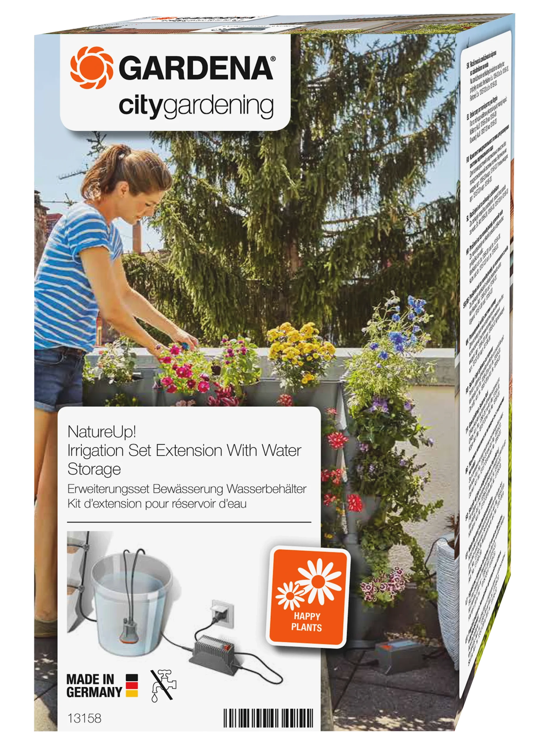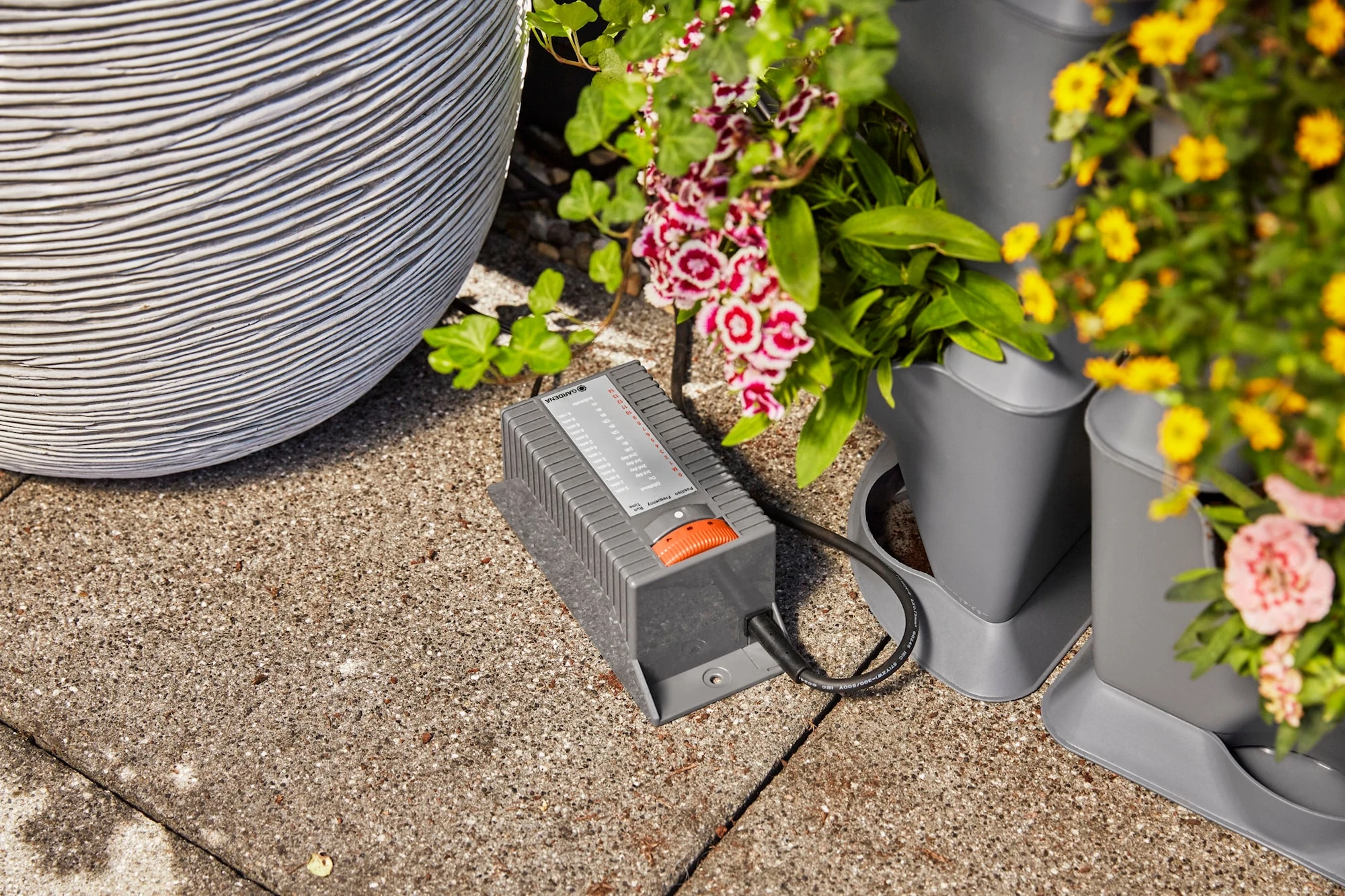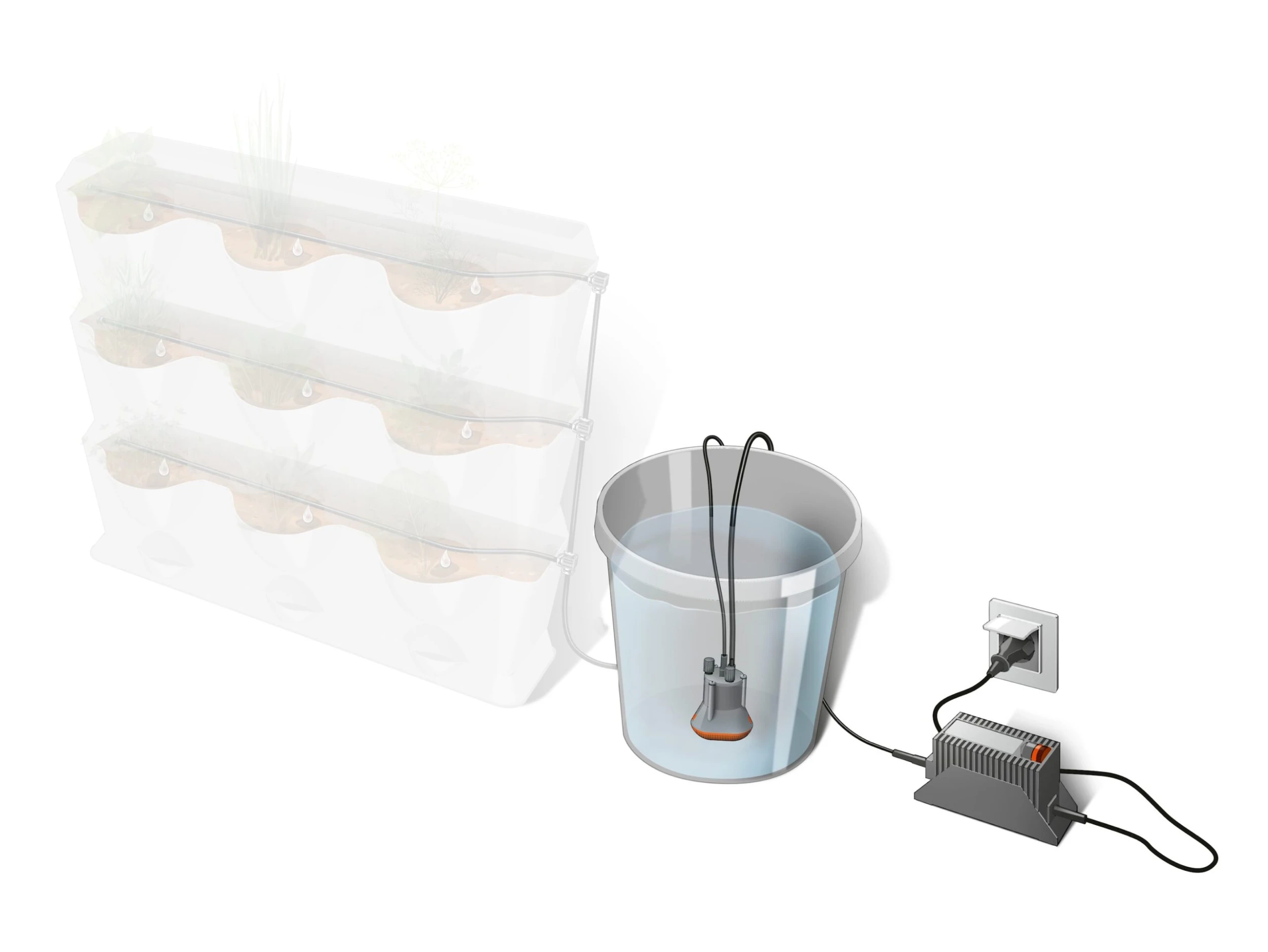 NatureUp! Bevattningsset med vattenbehÄllare löser enkelt bevattning av vertikala vÀxthÄllare Àven om det inte finns tillgÄng till vattenutkast. En 14 W lÄgspÀnningspump med smutsfilter förser plantorna med vatten. Transformatorn med inbyggd timer och 13 olika program för bevattning sÀkerstÀller pÄlitlig och flexibel anvÀndning utomhus.Setet Àr ett komplement till Nature Up!Bevattningsset för vertikala vÀxthÄllare motsvarigheten för hörn.