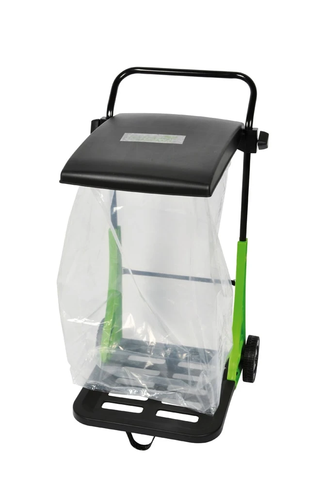 Avfallsvagn med lock och hÄllare för sopsÀck. komplett med hjul och sidostöd. Levereras med 1 st. sopsÀck.